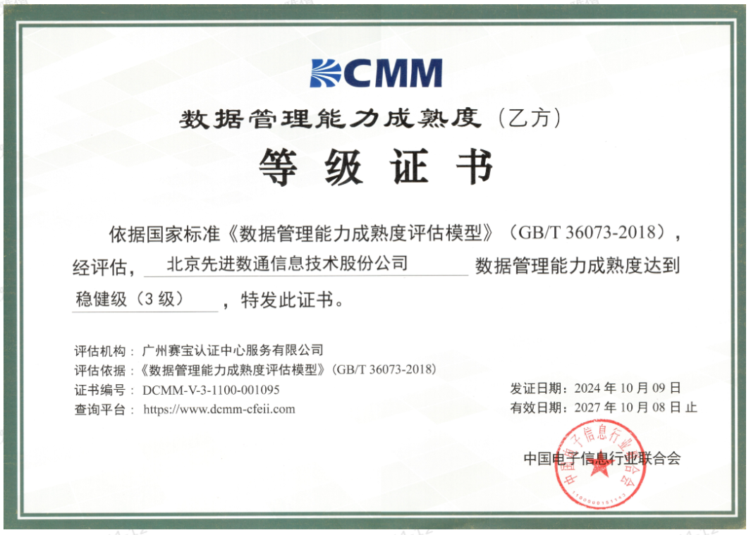近期,中国电子信息行业联合会公布了最新一批顺利获得数据管理能力成熟度(DCMM)贯标等级认证的企业名单。WM视讯平台 WM成功取得数据管理能力成熟度稳健级(三级)认证。这一认证的取得,标志着WM视讯平台 WM在数据治理体系构建和数据管理与应用能力方面,已经达到了国家权威组织认可的标准。这不仅是对WM视讯平台 WM在数据管理领域专业能力的肯定,也是对其在有助于数字化转型服务和数据驱动决策方面所做努力的认可。